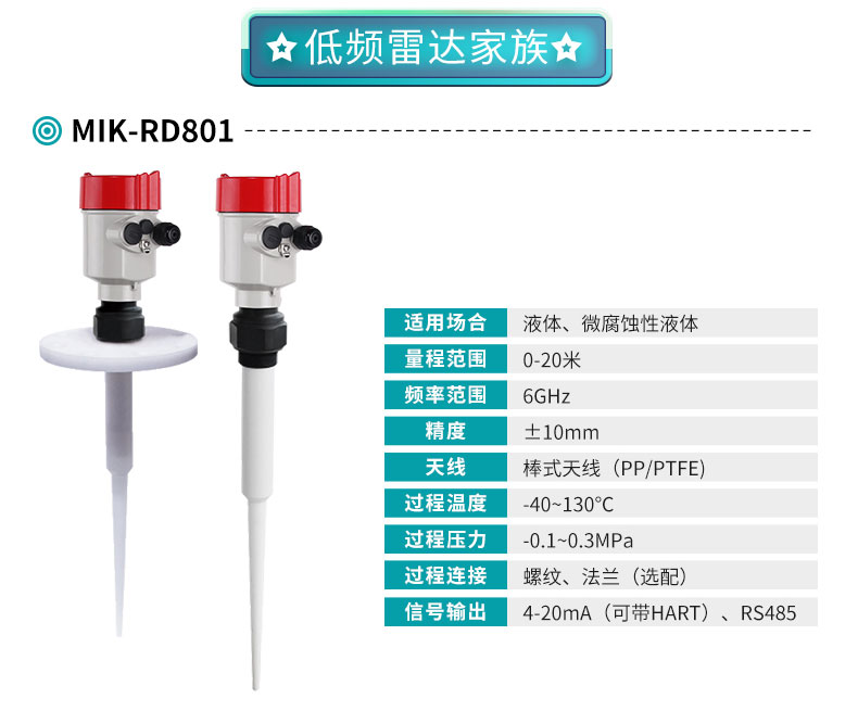 適用場合:米科MIK-RD80系列低頻雷達(dá)液位計(jì),新型快速的微處理器可以進(jìn)行更高速率的信號分析處理,使得儀表可以用于水液儲罐、酸堿儲罐、漿料儲罐、固體顆粒、小型儲油罐,以及各類導(dǎo)電、非導(dǎo)電介質(zhì)、腐蝕性介質(zhì),還有如煤倉、灰倉、油罐、酸罐等一些復(fù)雜的測量工況。