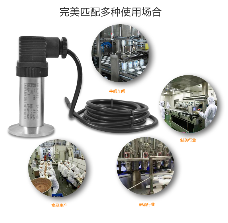 適用場(chǎng)合:MIK-P350系列平面膜結(jié)構(gòu)壓力變送器選用德國(guó)進(jìn)口擴(kuò)散硅芯體,采用平面膜直接感受壓力。傳感器接口有卡箍式,M27×2,法蘭式可供選擇。輸出信號(hào)有電壓、電流、頻率信號(hào)等可選擇,傳感器平膜片防止了結(jié)垢,不衛(wèi)生及粘稠液體堵塞等問題。廣泛應(yīng)用于食品、醫(yī)藥、衛(wèi)生及釀酒工業(yè)等部門。