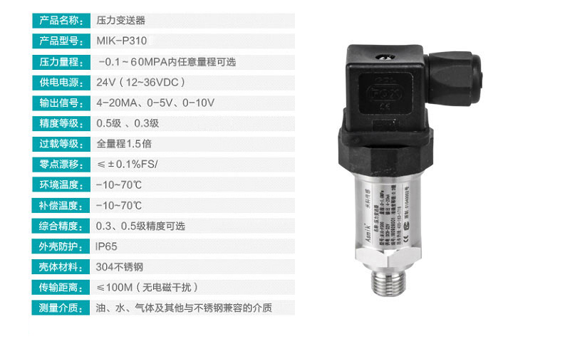 MIK-P310系列壓力變送器壓力敏感核心采用了高性能的進口硅壓阻式壓力充油芯體,內部的專用集成電路將傳感器毫伏信號轉換成標準電壓、電流或頻率信號,可以直接與計算機電路接口卡、控制儀表、智能儀表會PLC等方便相連。遠距離傳輸可以采用電流輸出方式。具有體積小、重量輕、全不銹鋼密封結構,可在腐蝕性環(huán)境中工作。該產品安裝方便簡潔,具有高抗震和抗沖擊性能。