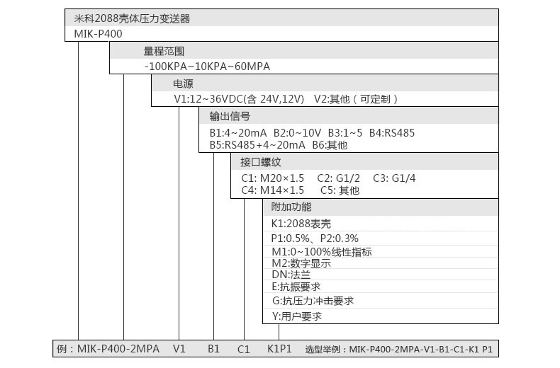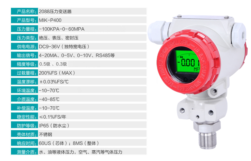 MIK-P400型工業(yè)型壓力變送器采用OEM全焊接壓力芯體,微型放大器處理電路。零點(diǎn)量程可遷移。其安裝接口形式,即可根據(jù)用戶的要求加工,可提供與其他品牌變送器兼容的規(guī)格。該系列產(chǎn)品廣泛應(yīng)用于工業(yè)過程控制、液壓設(shè)備、化工等行業(yè)。針對(duì)工業(yè)現(xiàn)場(chǎng)環(huán)境比較惡劣的情況該產(chǎn)品有比較明顯的優(yōu)勢(shì),其防護(hù)等級(jí)達(dá)到IP67。