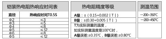 1. 響應(yīng)時(shí)間少,減少動(dòng)態(tài)誤差; 2. 可彎曲安裝使用; 3. 測(cè)量范圍大; 4. 機(jī)械強(qiáng)度高,耐壓性能好; 5、熱電阻測(cè)溫范圍-200°~450°,熱電偶測(cè)溫范圍-200°~1100°