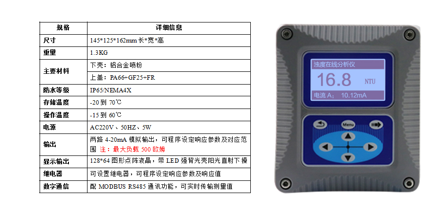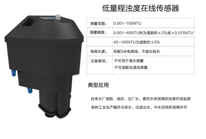 適用場合:濁度在線分析儀具有超低濁度檢出限、高精度測量、設(shè)備長時間免維護、省水工作和數(shù)字化輸出的特點,可廣泛應(yīng)用于自來水出廠水、二次供水、管網(wǎng)末梢水、直飲水、膜過濾水、游泳池、地表水等濁度在線監(jiān)測。